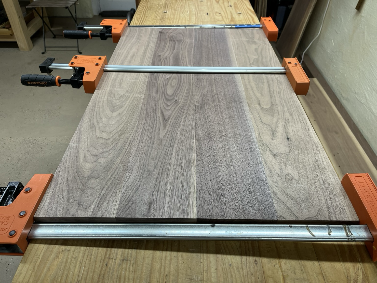 Four walnut boards laying side by side with clamps and the gaps closed.