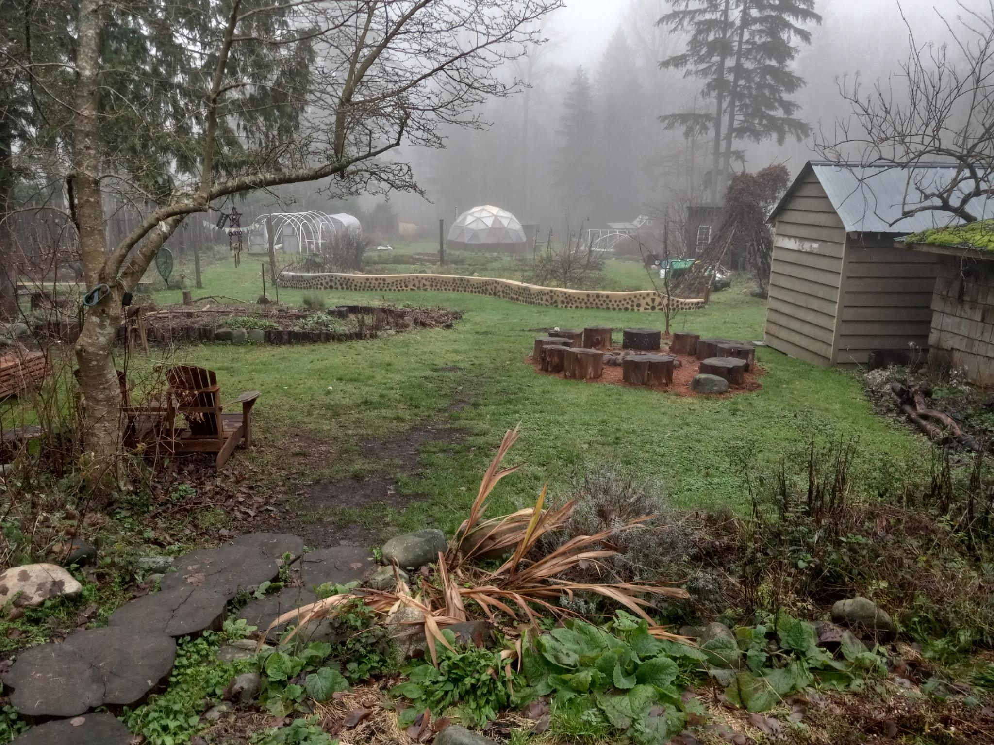 A view of a small, tidy farm in BC winter, so most of the beds are sleeping. There are a couple of small farm buildings, a large dome, and a lovely undulating cobb wall. There are some tall trees here and there, and everything is green. The sky is misty and its hard to see the most distant trees.