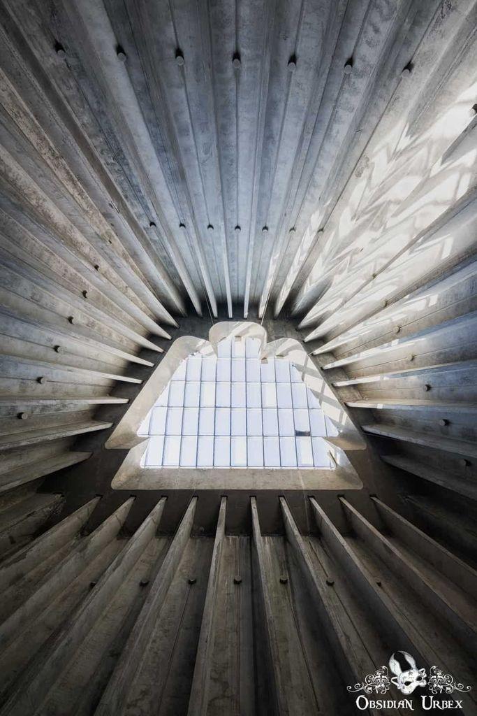 An upward shot reveals the dramatic triangular skylight of a Brutalist-style church, featuring ribbed concrete architecture.