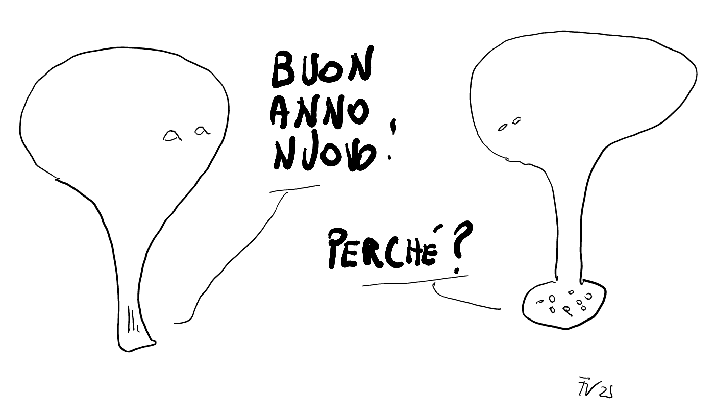un teschio stilizzato, Smig, dice "buon anno nuovo!" a Smog, un teschio stilizzato con una specie di maschera antigas che risponde "perchΓ©?"