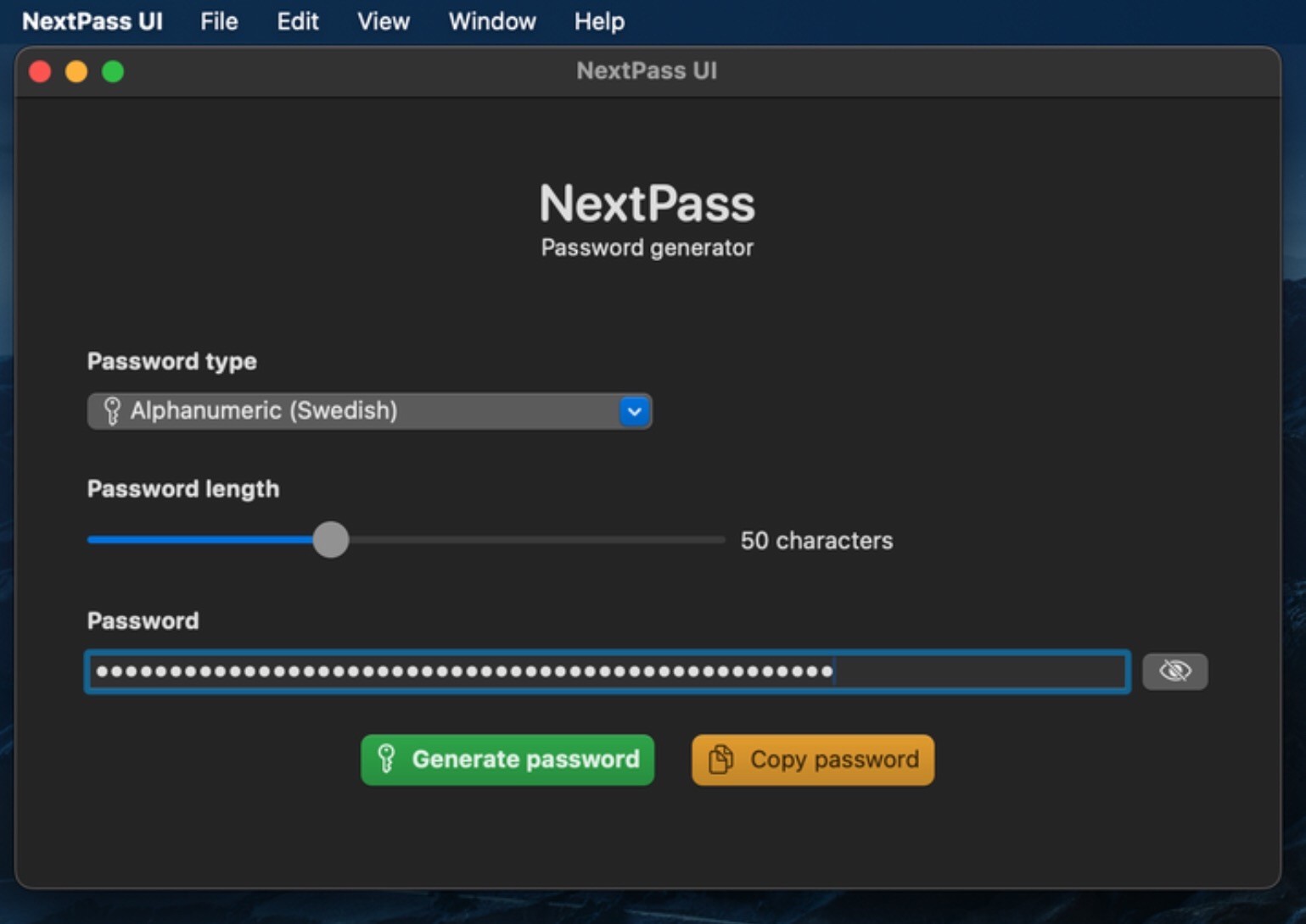 Cropped screenshot of a password manager for MacOS. Randomised array limited to alpha-numeric Swedish characters has been selected from a list of password types.