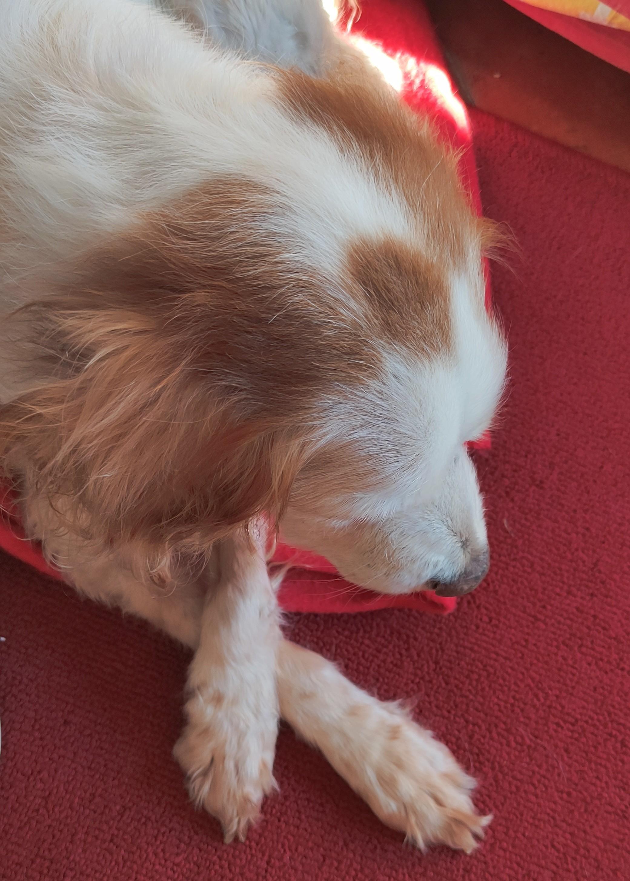 la Zanza, Breton bianco arancio di 17 anni, accovacciata su un tappeto rosso, fotografata dall'alto, si vede la testa e le zampe incrociate