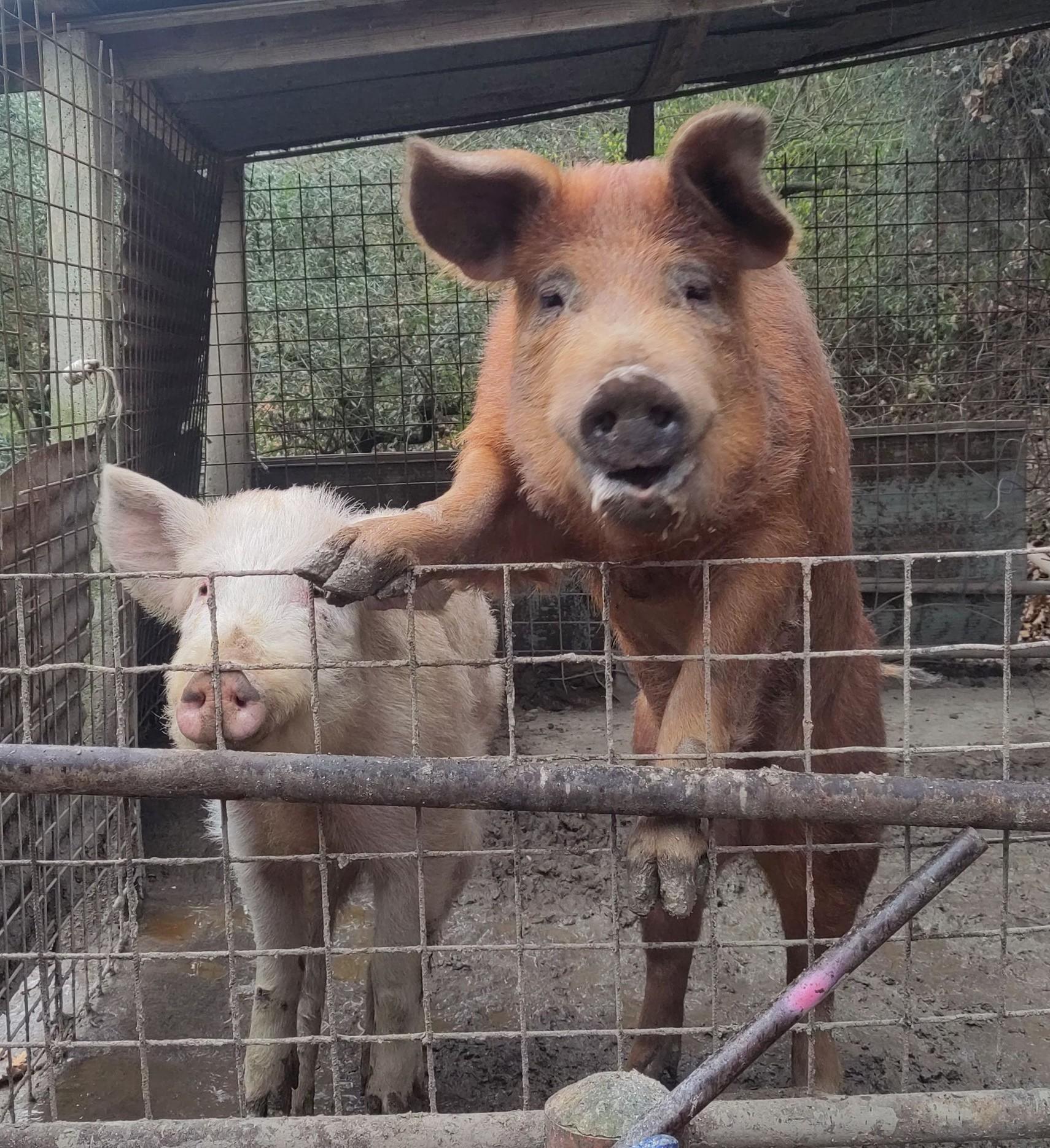 due maiali, uno ride appoggiando la zampa sulla recinzione
