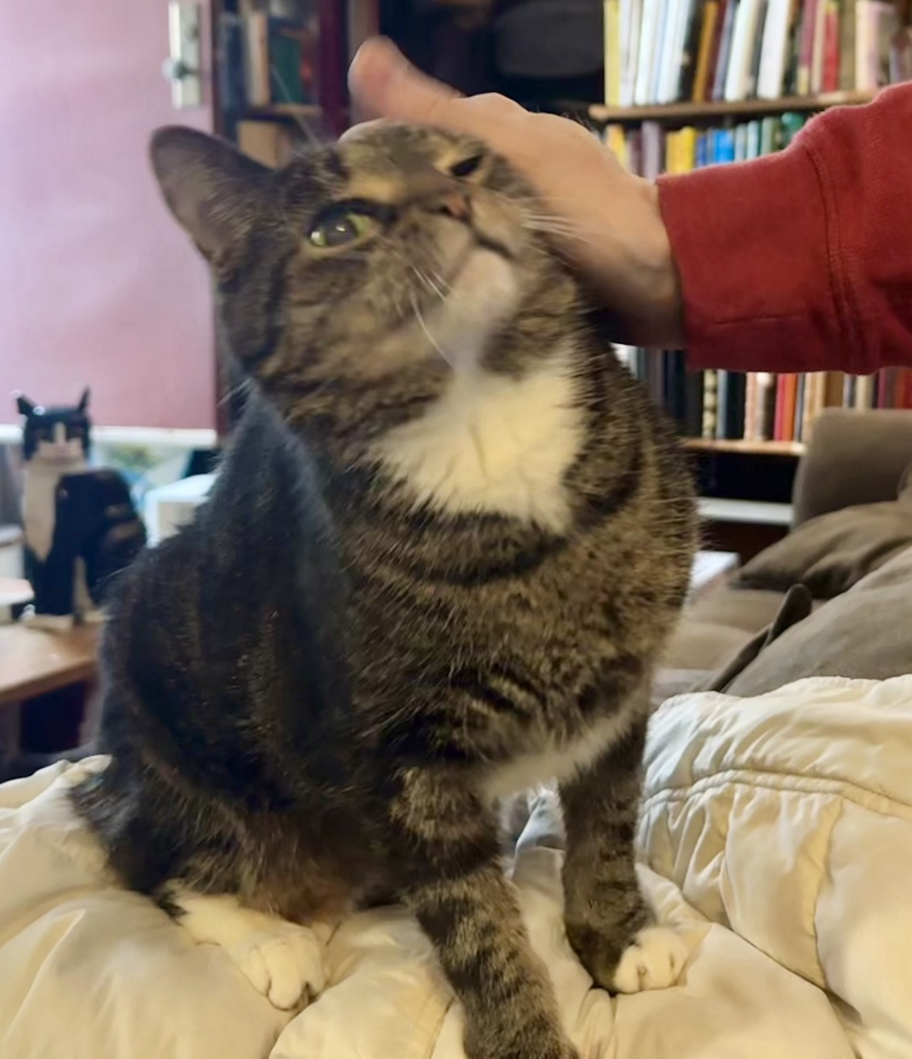 The same brown tabby cat with a white patch on her chest, starting to enjoy the petting more