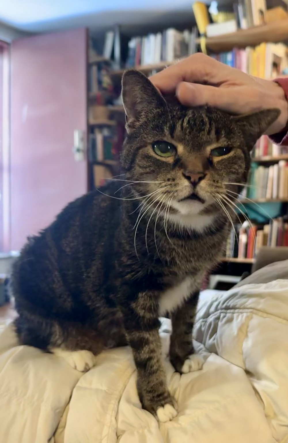 The tabby cat with one eye partially closed and one eye more open. She looks like sheβs contemplating something