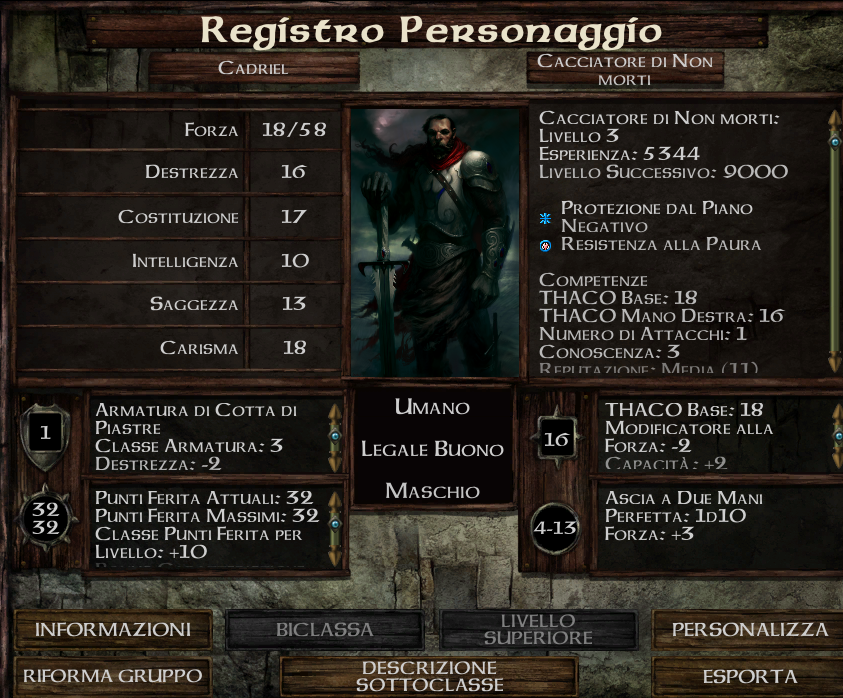 L'immagine mostra la schermata del personaggio Cadriel e le sue statistiche.