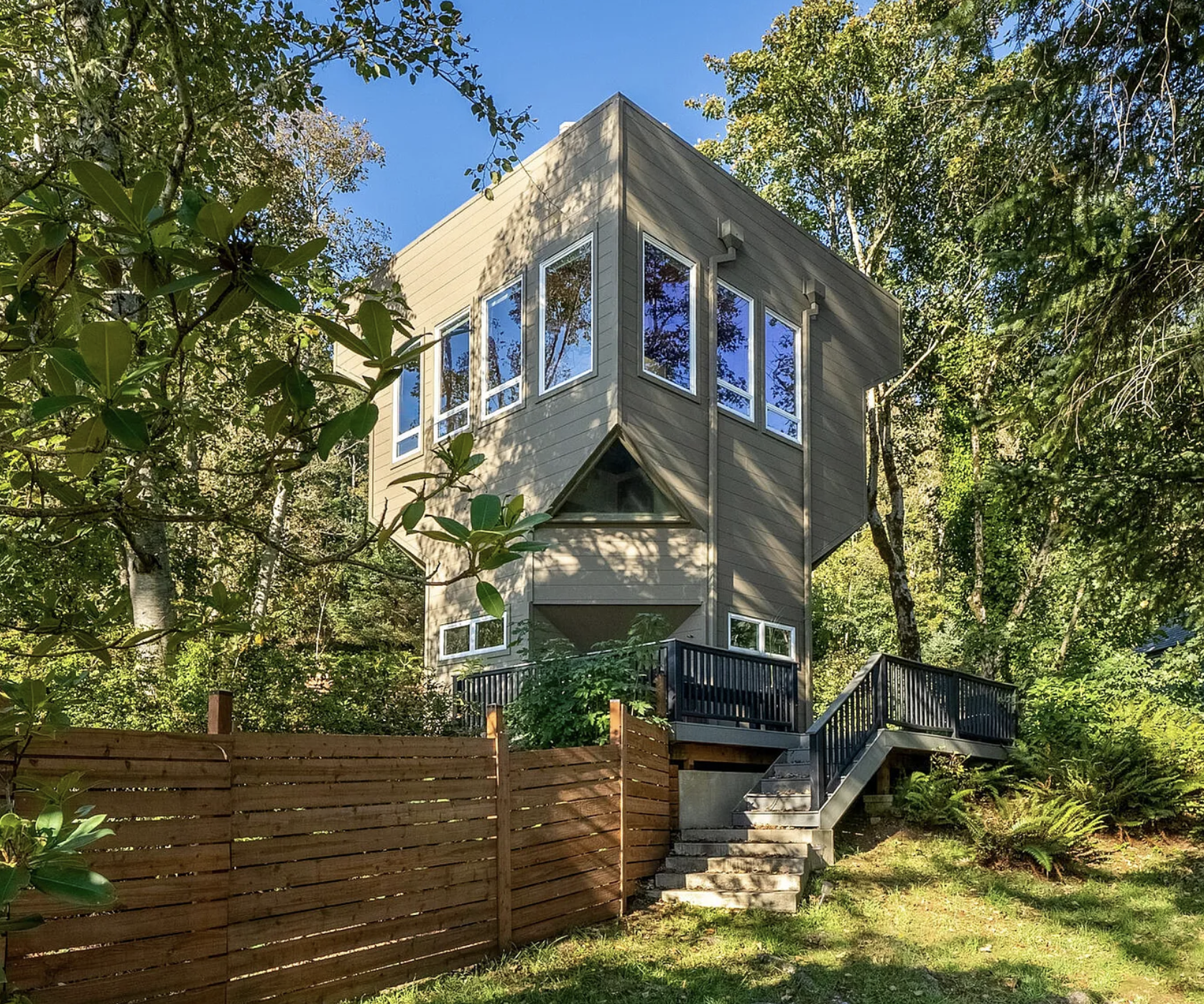 A bizarrely shaped 3 story house. It comes to a point in the middle with a triangle window in the centre and the lower floors are smaller than the upper floors. It looks a bit like a helmet but angular.