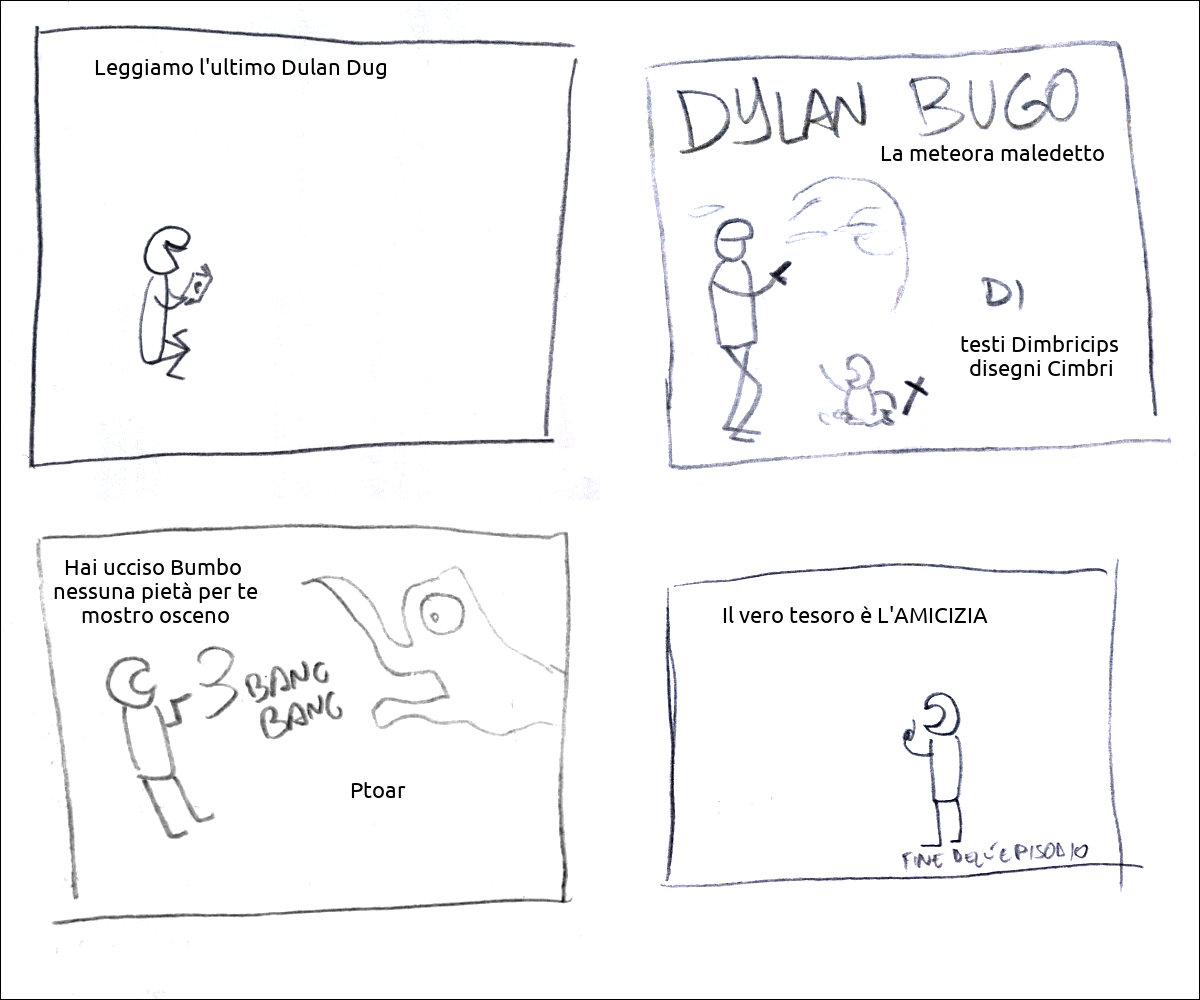 un tizio legge un fumetto e dice: «Leggiamo l'ultimo Dulan Dug» Frontespizio di Dylan Bugo in «La meteora maledetto» testi Dimbricips disegni Cimbri Dylan Bugo spara a un mostro urlando: «Hai ucciso Bumbo nessuna pietà per te mostro osceno» Dylan Bugo dice: «Il vero tesoro è L'AMICIZIA»