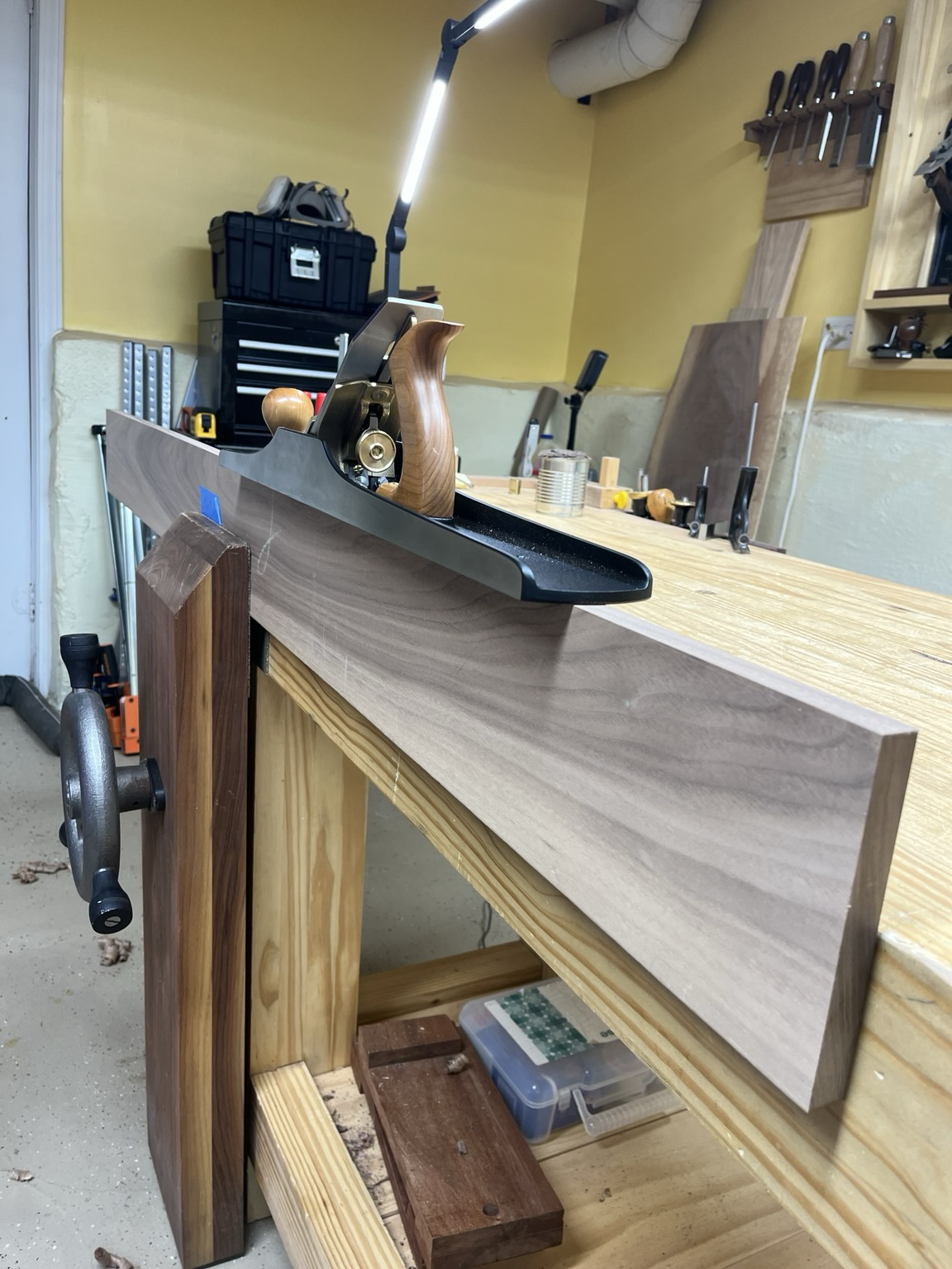 A No. 7 jointer plane on top of the ended of a walnut board. The board is clamped in the bench vise.