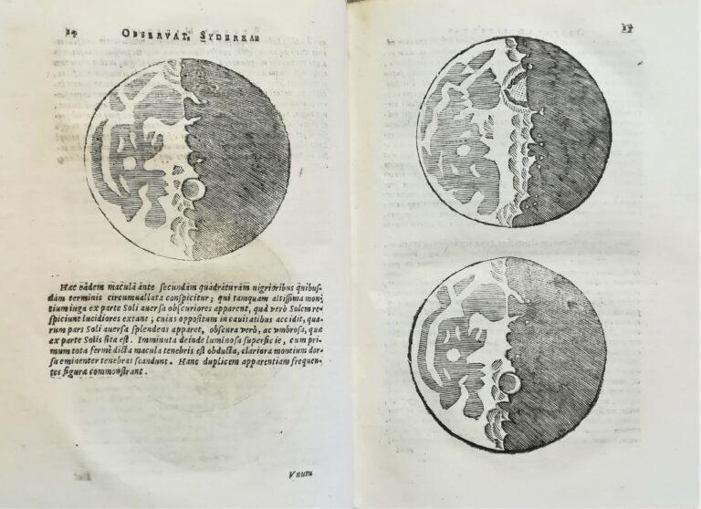 This is a historic page showing three of Galileo Galilei's pioneering telescopic observations of the Moon, from his Opere di Galileo Galilei (1655), held in the Rare Books and Special Collections Division at the Library of Congress. The page displays three circular illustrations of the Moon in different phases, arranged with two at the top (left and right) and one at the bottom right. The page header reads "OBSERVAT SIDERUM" (Observations of the Stars/Heavens), with page numbers visible (34 and 35, suggesting this is a two-page spread). https://brescia-raccoltestoriche.unicatt.it/storie/la-sezione-galileo-galilei/