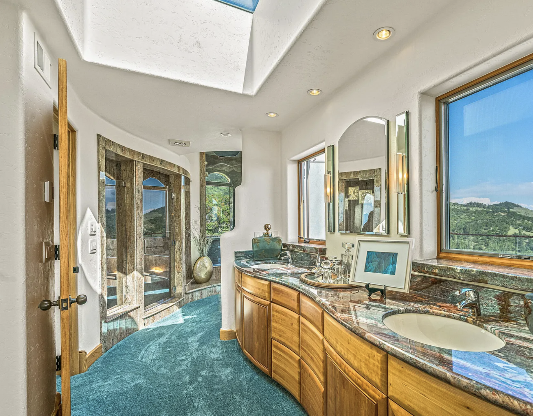 A very large bathroom with a curving wood vanity with marble top, and teal coloured plush carpet on the floor.