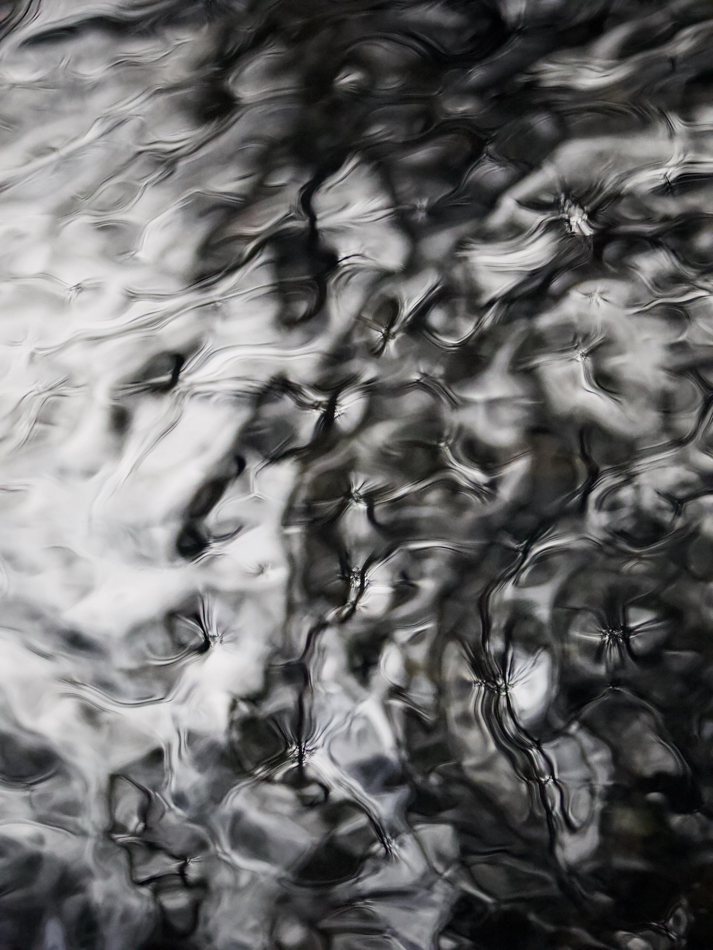 Ripples and reflections in the calmer pools on a fast-moving stream create beautiful shapes and textures where low winter sunlight catches the surface of the water