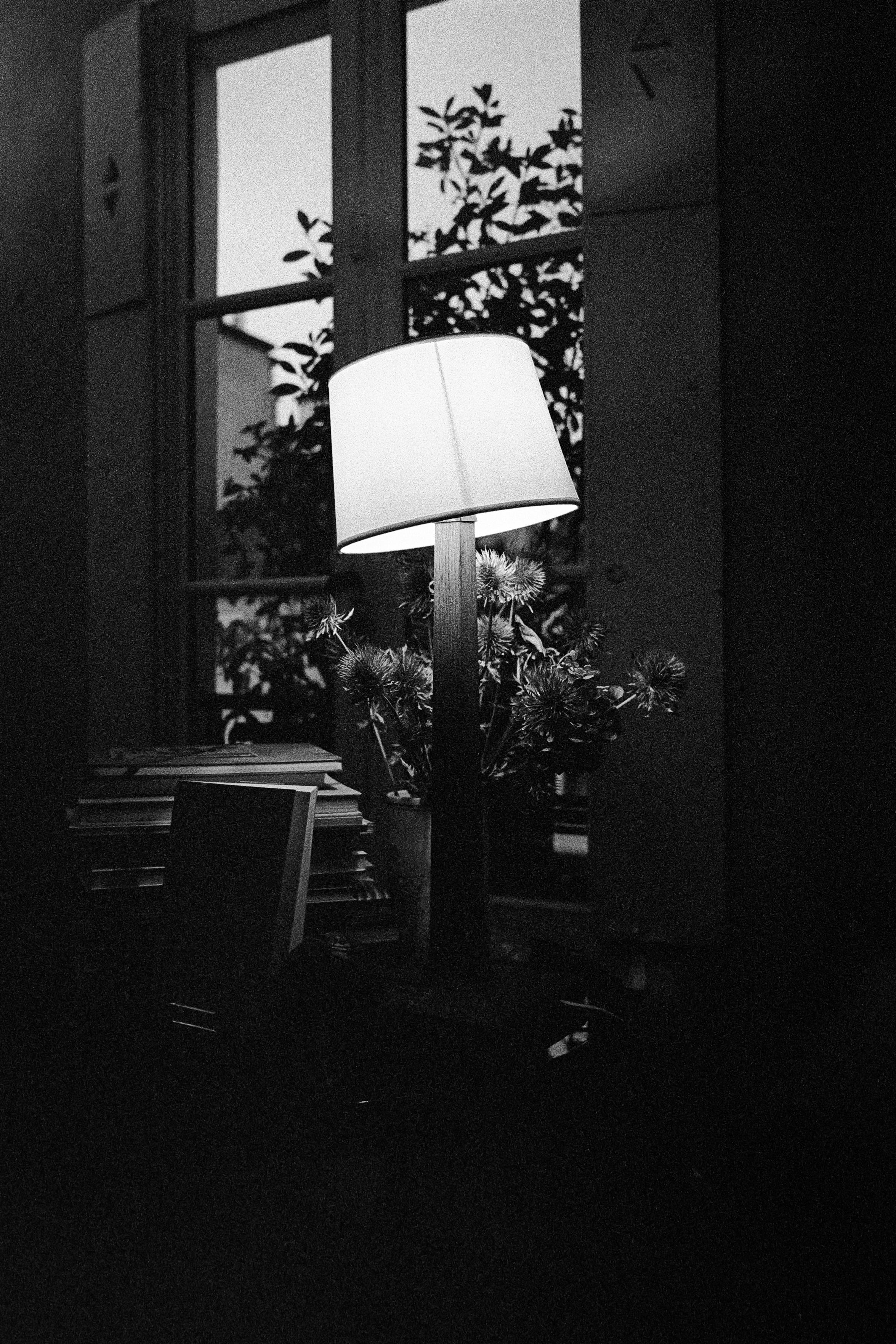 A black & white photo of a small lamp at the center of a still life scene composed of books and dried flowers on a small table in front of a window at dusk