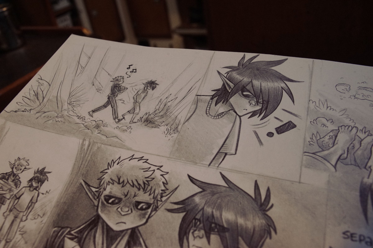 a photo of a sketchbook page, showing frames that are inked with a ball point pen and partially shaded with pencil(not yet finished)