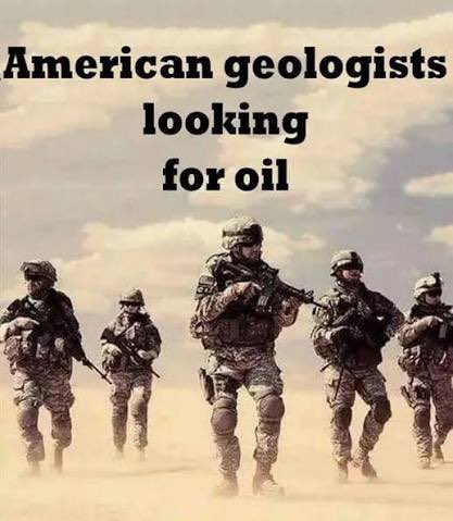 Photo of US soldiers on a mission with guns drawn and the words "American geologists looking for oil."