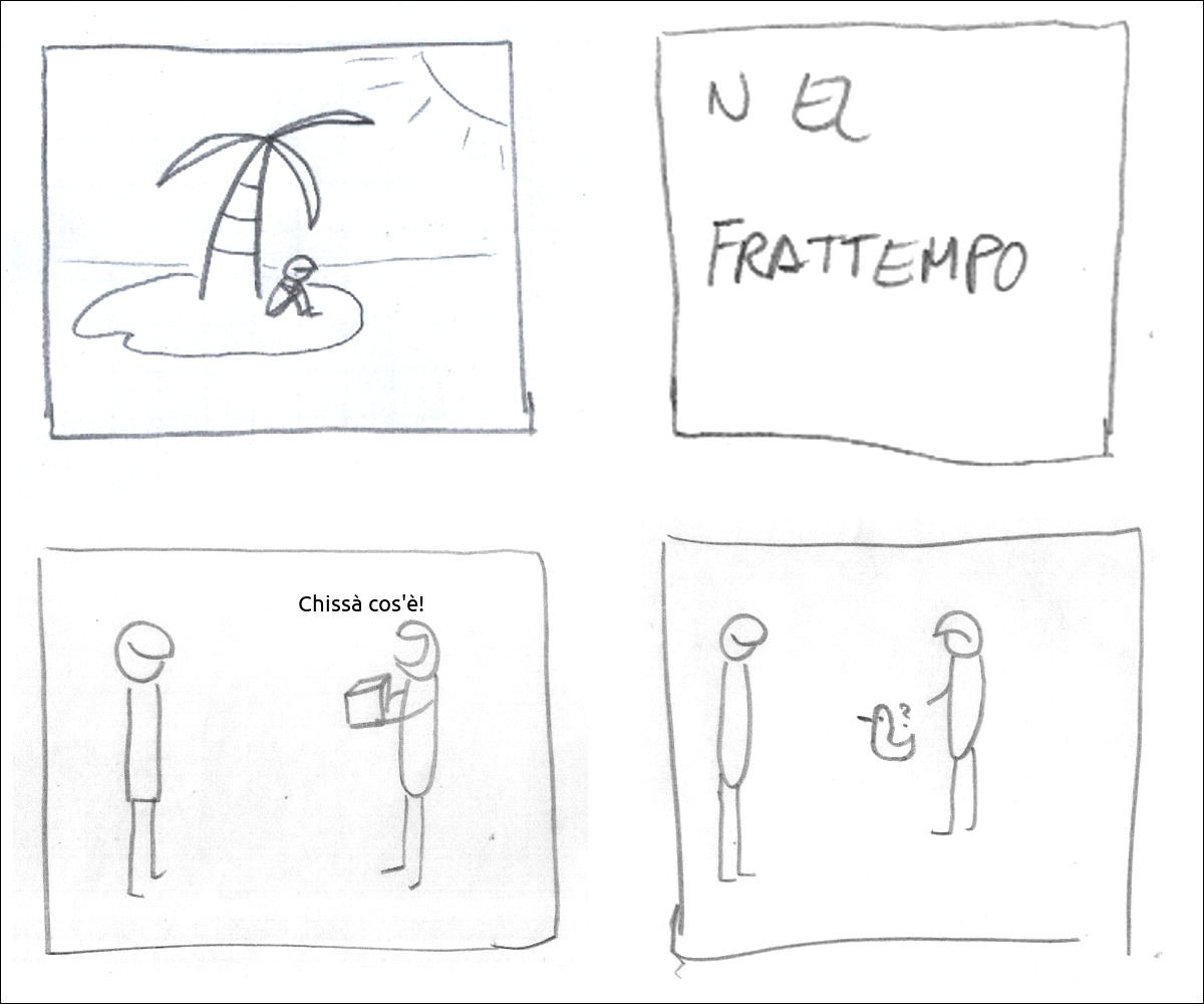 c'Γ¨ un tizio su un'isola deserta didascalia: nel frattempo il secondo tizio ringrazia dicendo: Β«ChissΓ cos'Γ¨!Β» dentro il pacco c'era una papera il tizio Γ¨ insoddisfatto