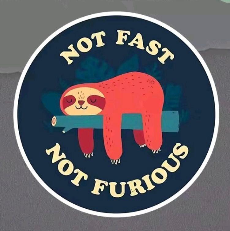 Un adesivo circolare con un'imbottitura blu scuro presenta uno sloth rosso con gli occhi chiusi che pende da un ramo teal; lo sloth ha un viso leggermente bruno, un piccolo naso e minuscole zampe bianche, con forme di fogliame blu sottili sullo sfondo. Testo in un font chiaro, curvo, che dice "NON VELOCE" in cima e "NON FURIOSO" in basso.