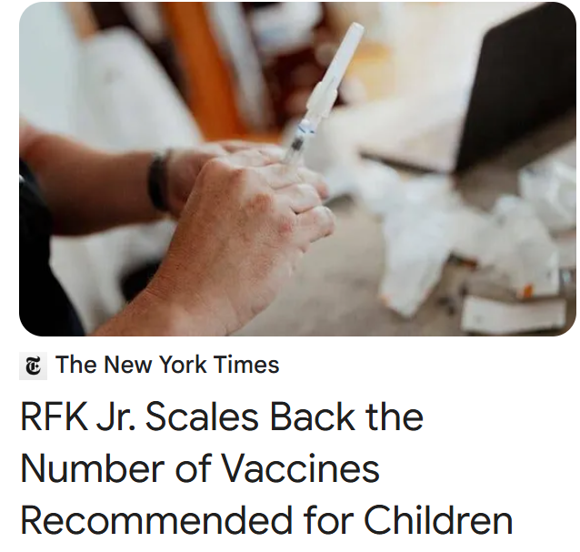 NY Times headline: "RFK Jr. Scales Back the Number of Vaccines Recommended for Children"