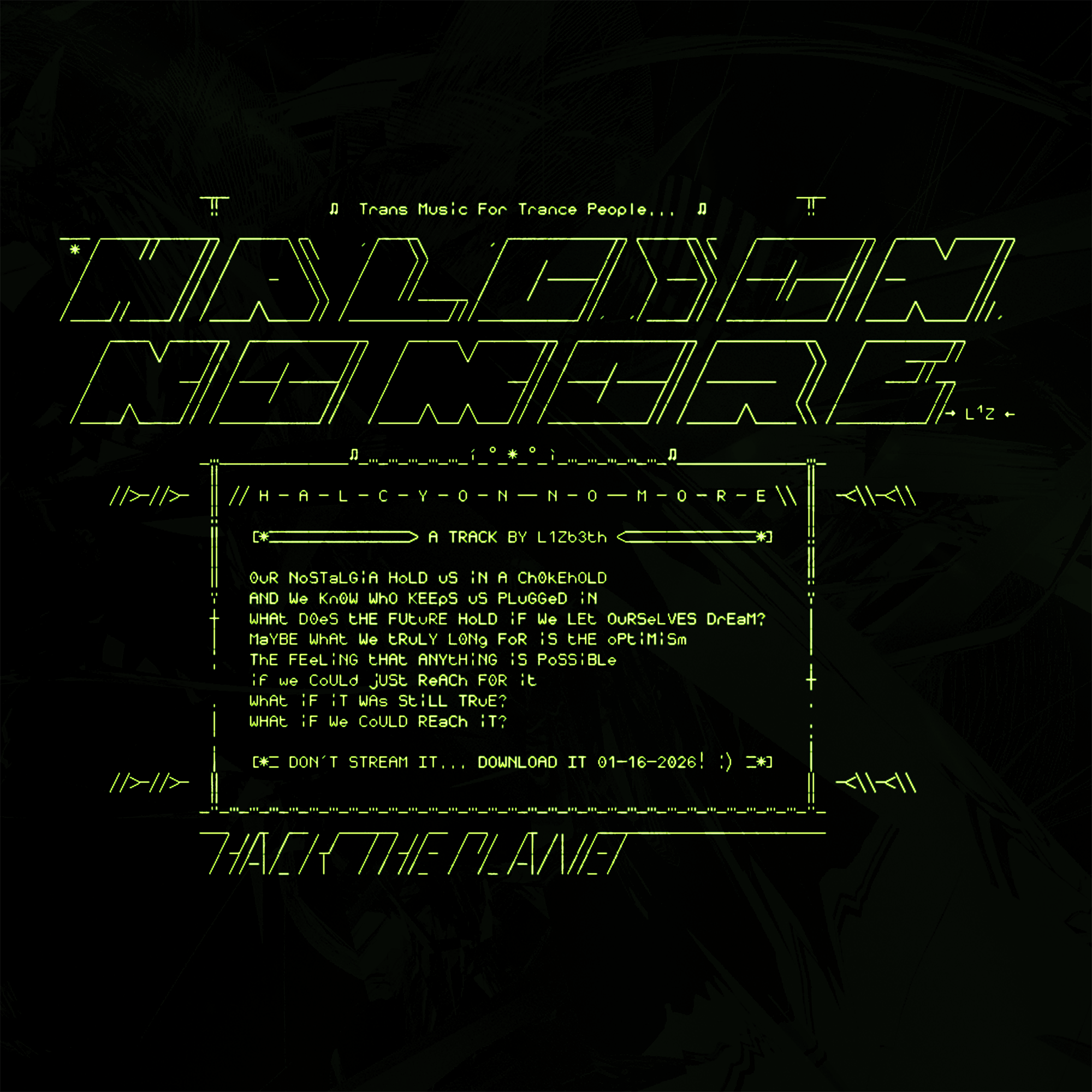 ASCII art in green on black with big ornate letters at the top reading "HALCYON NO MORE", under it is a decorated block of text with the lyrics of the song and its release date of January 16. Over the big text, there is small text that reads "Trans music for trance people" and at the very bottom is a line that reads "HACK THE PLANET"