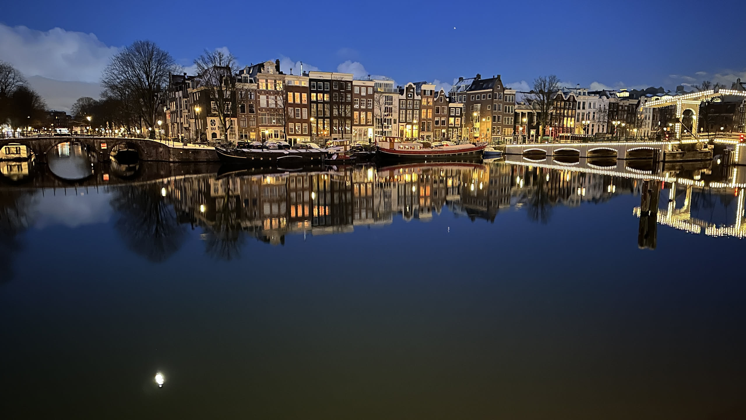 canal houses along a river with an illuminated bridge to the side. the reflections of the moon and houses are visible in the ripples.