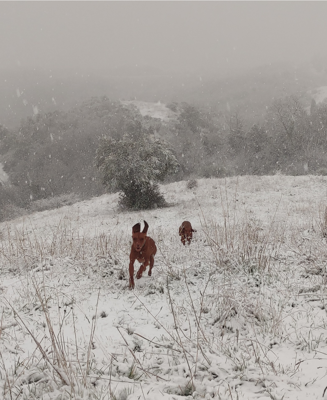 due bracche ungheresi ad orecchie al vento nella neve