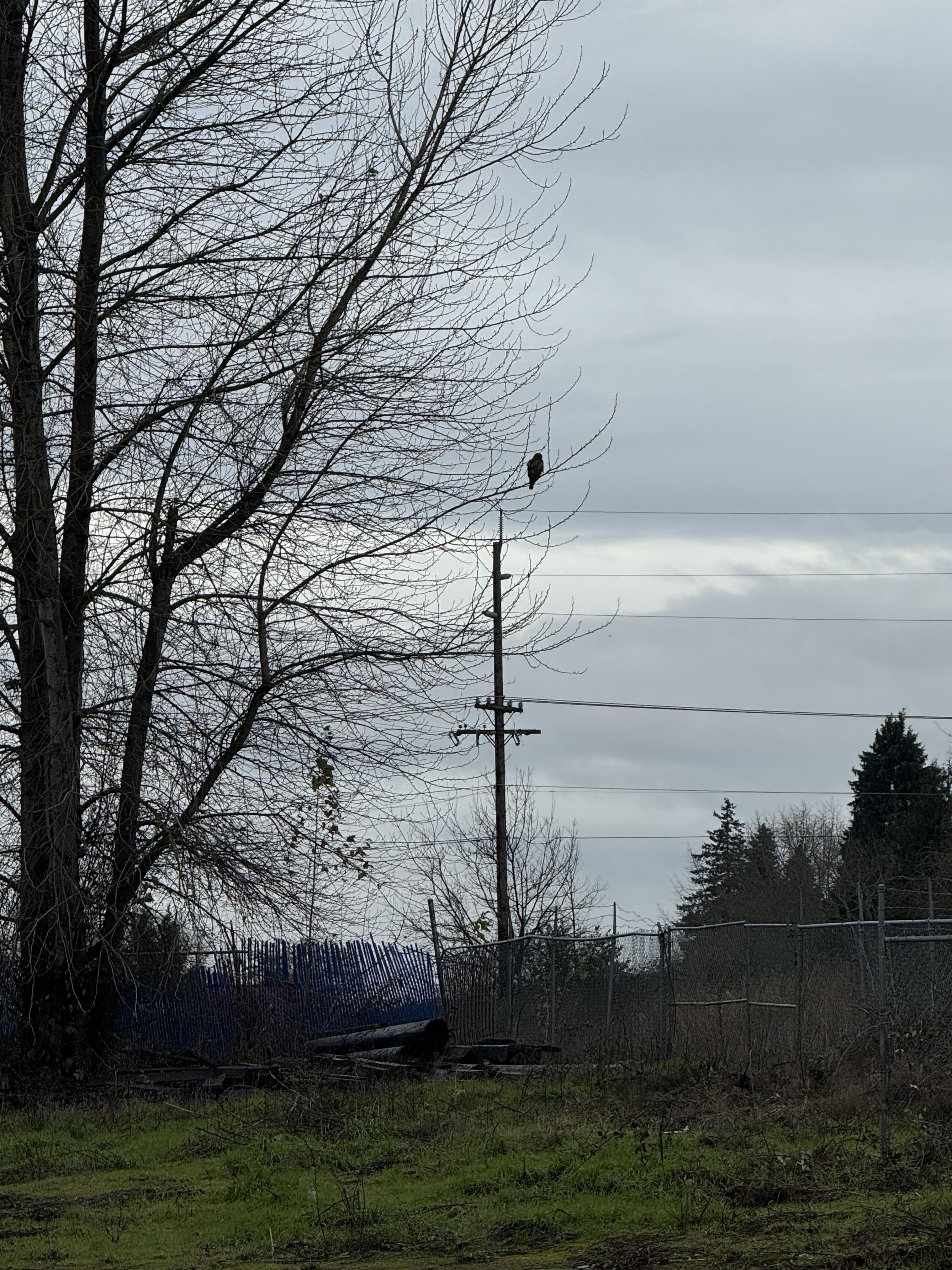 A bare tree stands in the foreground with a bird perched on its branch. In the background, utility poles and fences can be seen, along with a cloudy sky. The landscape is mostly bare, with patches of grass and some scattered debris. A medium sized bird is visible in silhouette