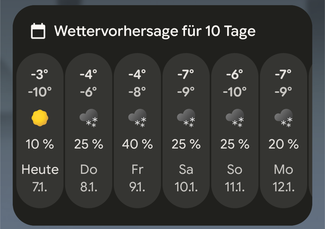 Screenshot di una weather app che mostra le previsioni del tempo per Berlino dal 7 al 12 gennaio. Prevista neve tutti i giorni tranne il 7, temperature massime tra -3 e -7, minime tra -6 e -10.
