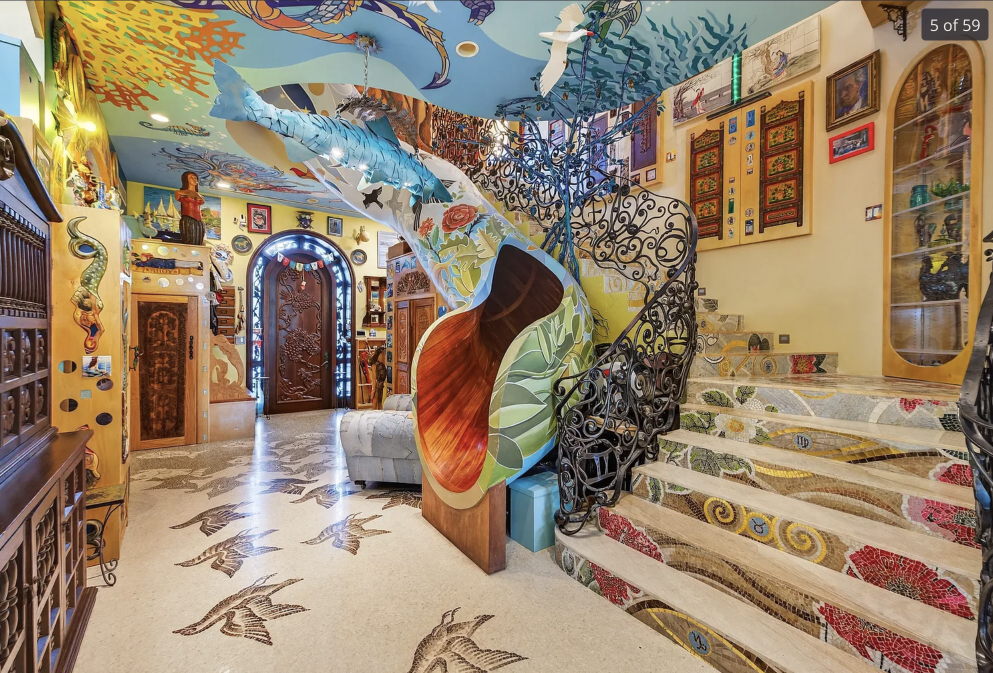 A curving slide next to a stairway, the slide is painted bright colours and has stained timber on the inside.