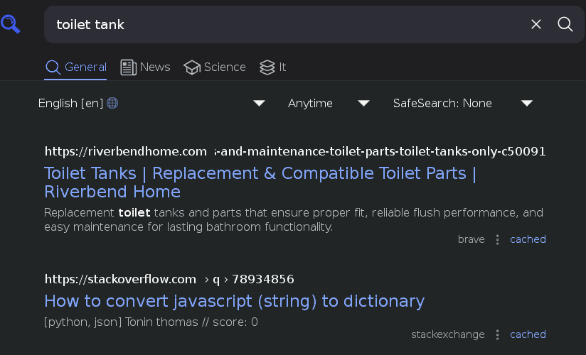 Ricerca di "toilet tank" con SearXNG. Il secondo risultato รจ una pagina di Stackoverflow dal titolo "How to convert javascript (string) to dictionary".