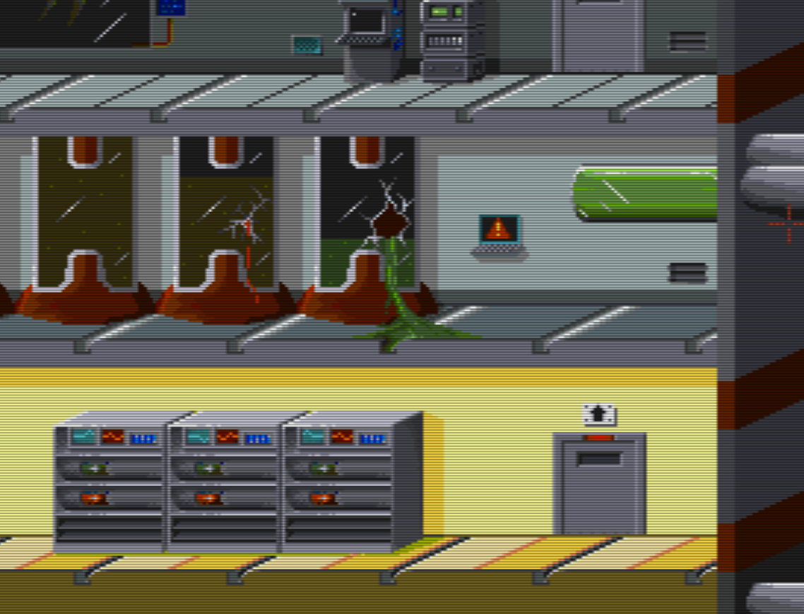 In the shot there is part of room 21, this room is on 3 levels. In the top level there something unclear on the left, a terminal and an electronic device, and a door on the right. In the mid level there are 3 glass cylinders, the right one is broken with some green fluid on the ground. There is also a small terminal and another horizontal container with greenish fluids inside. In the lower level there are some devices with small monitors on them and on the right there is a door.