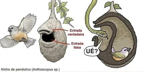 Diagram showing the layout of a birds nest made by the Penduline Tit bird. The nest has a concealed real entrance, and a wide-open false entrance that only leads to an unused dead end. The diagram shows a snake entering the false entrance, looking for delicious eggs but finding only empty space. Since this is from a Spanish language textbook, the snake is confusedly exclaiming "UĆ?"