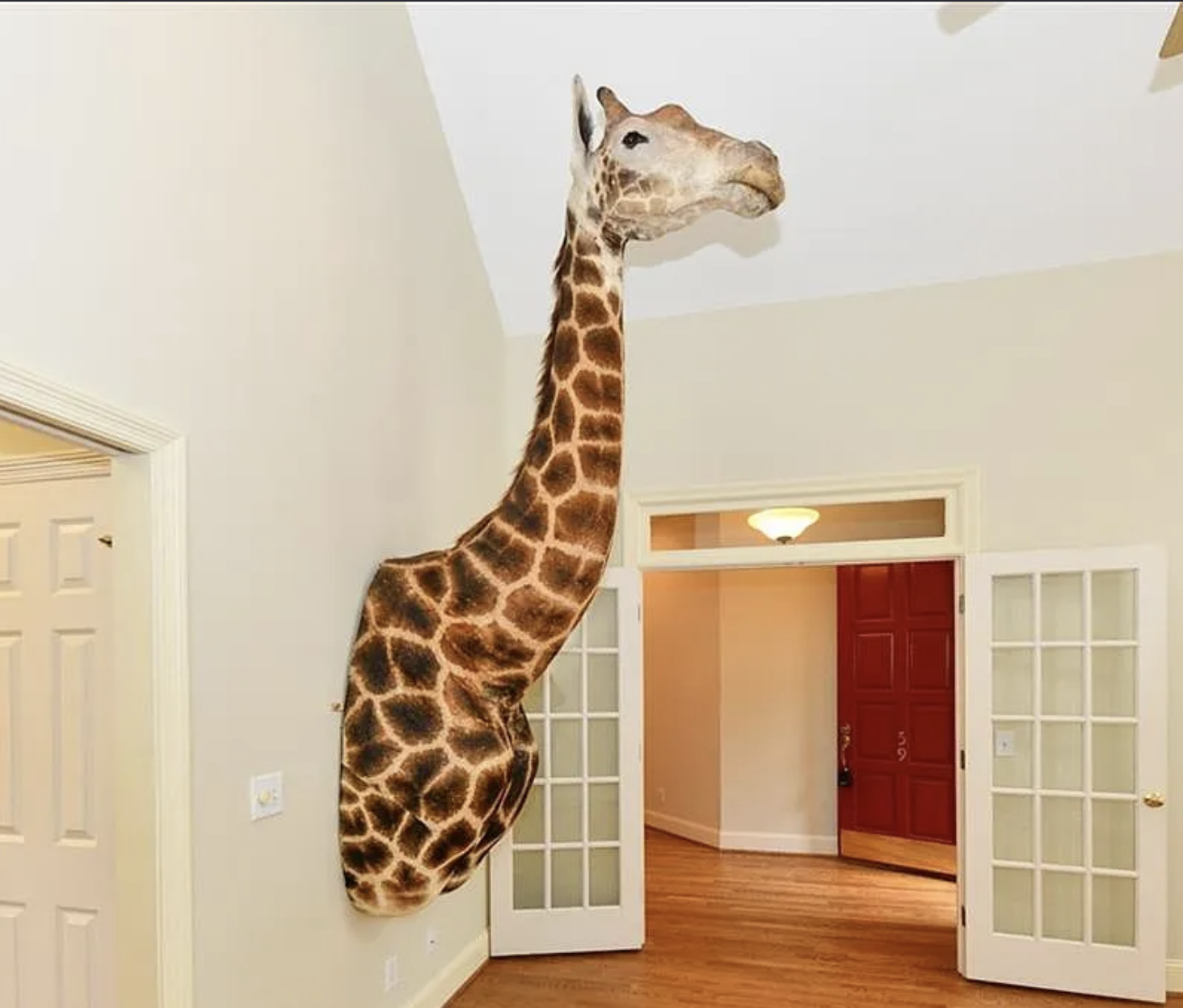Another view of the same front of a giraffe coming out of the wall.