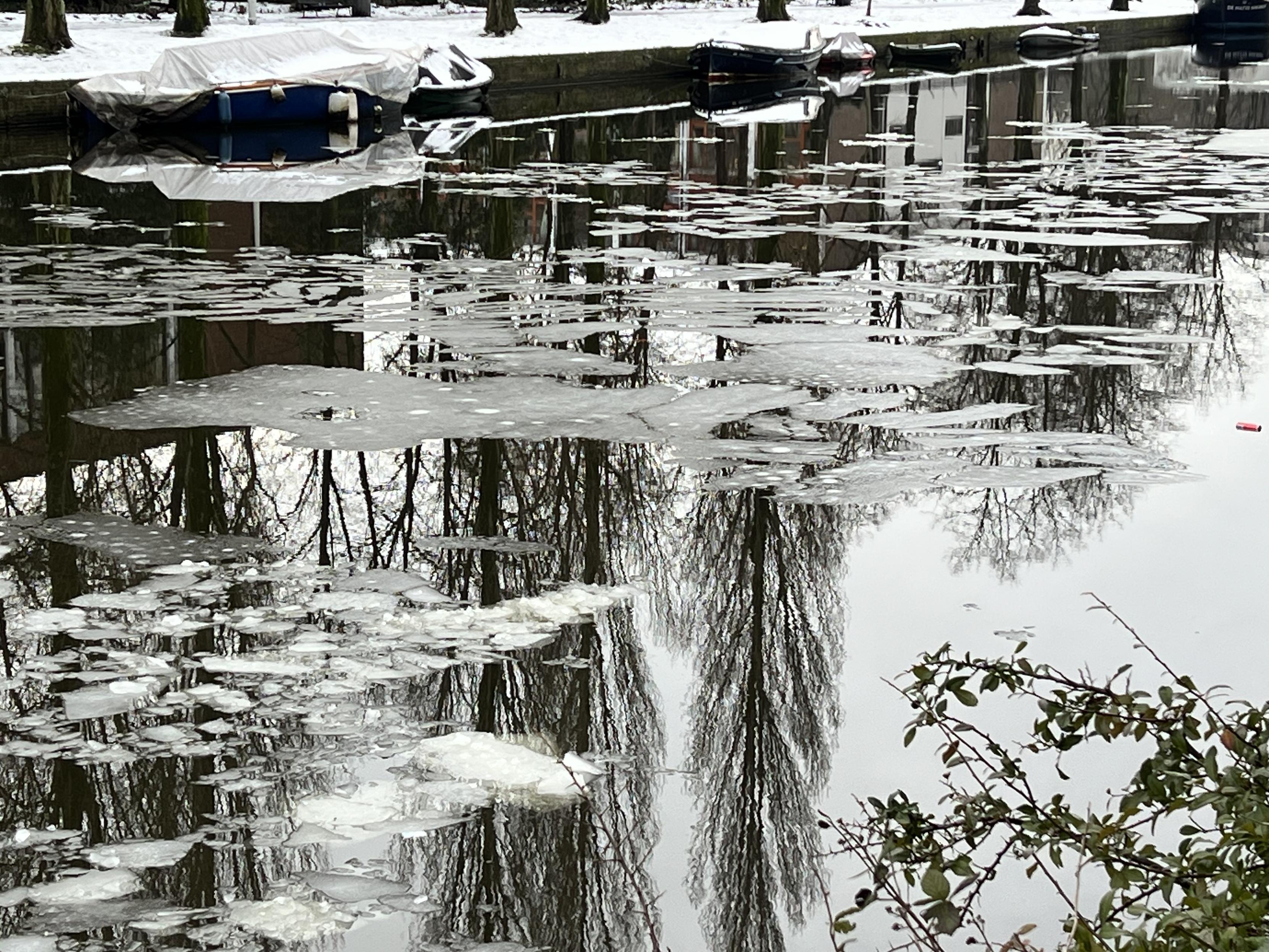 Canal with ice in it. There is a bush in the foreground and two boats on the other side.