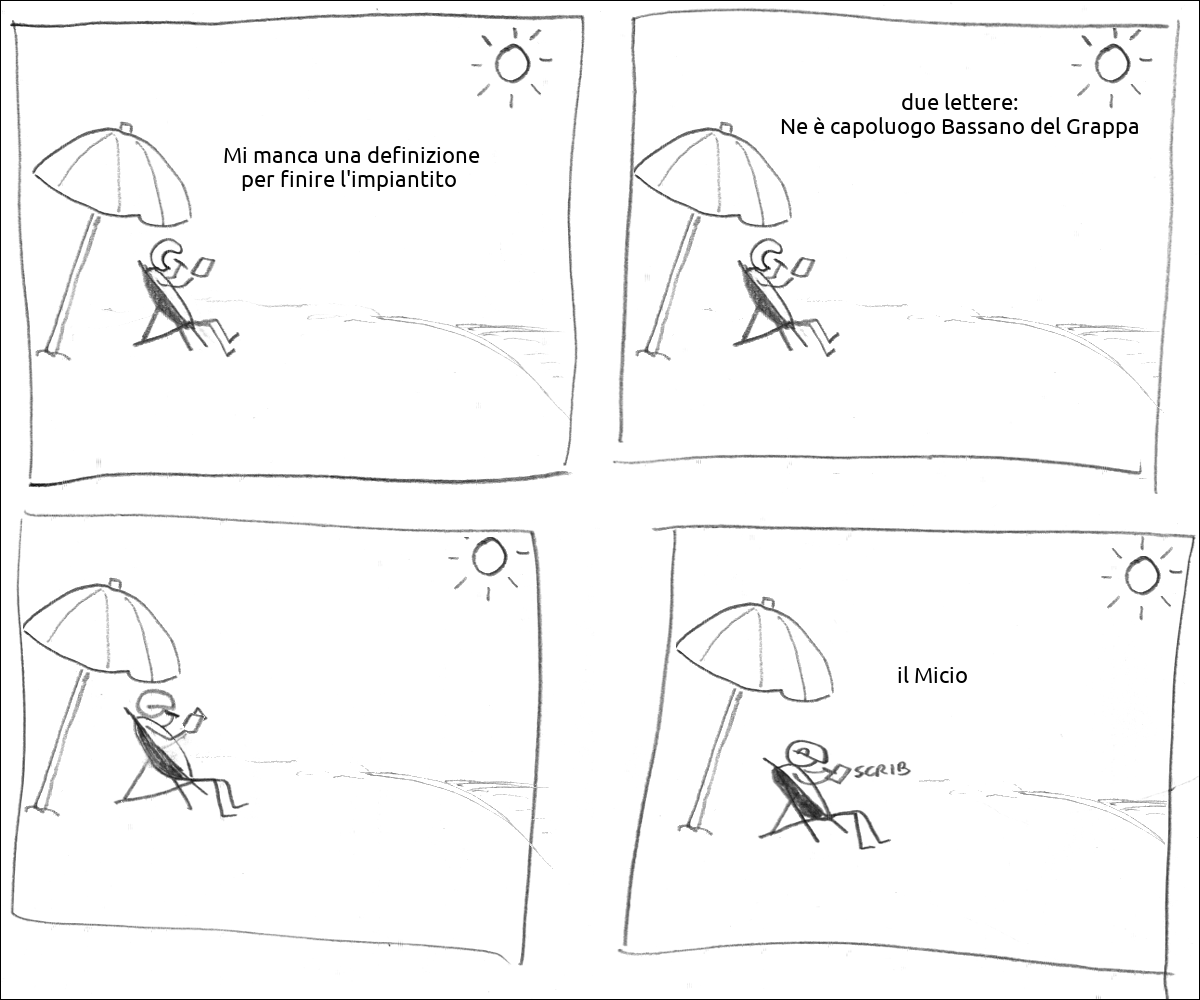 Un tizio sulla spiaggia sotto l'ombrellone dice: ยซMi manca una definizione per finire l'impiantito ยป Il tizio dice: ยซdue lettere: Ne รจ capoluogo Bassano del Grappaยป Il tizio pensa Il tizio scrive: il Micio