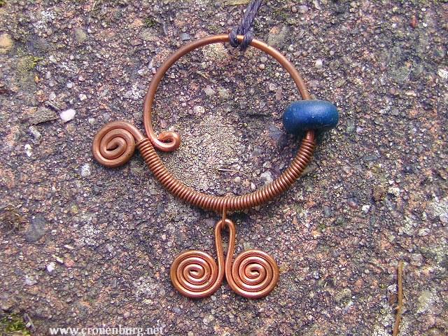 A copper wire pendant formed like a circle which is open at the left, opening in a small wire loop and a spiral. A blue bead at the right. The bead holds in this place because the lower part of the thick wire is tightly wound with thin wire. From the middle of the lower part hangs a tiny double spiral pendant. The counter-rotating spirals were a popular symbol of this period and were also found engraved on stones.