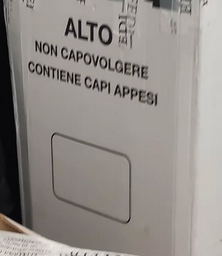 una scatola con scritto "ALTO - NON CAPOVOLGERE - CONTIENE CAPI APPESI"