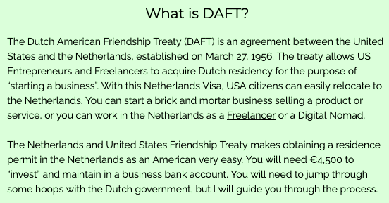 The text of an explainer on the DAFT treaty. It's verbose but here is the text: The Dutch American Friendship Treaty (DAFT) is an agreement between the United States and the Netherlands, established on March 27, 1956. The treaty allows US Entrepreneurs and Freelancers to acquire Dutch residency for the purpose of “starting a business”. With this Netherlands Visa, USA citizens can easily relocate to the Netherlands. You can start a brick and mortar business selling a product or service, or you can work in the Netherlands as a Freelancer or a Digital Nomad. The Netherlands and United States Friendship Treaty makes obtaining a residence permit in the Netherlands as an American very easy. You will need €4,500 to “invest” and maintain in a business bank account. You will need to jump through some hoops with the Dutch government…