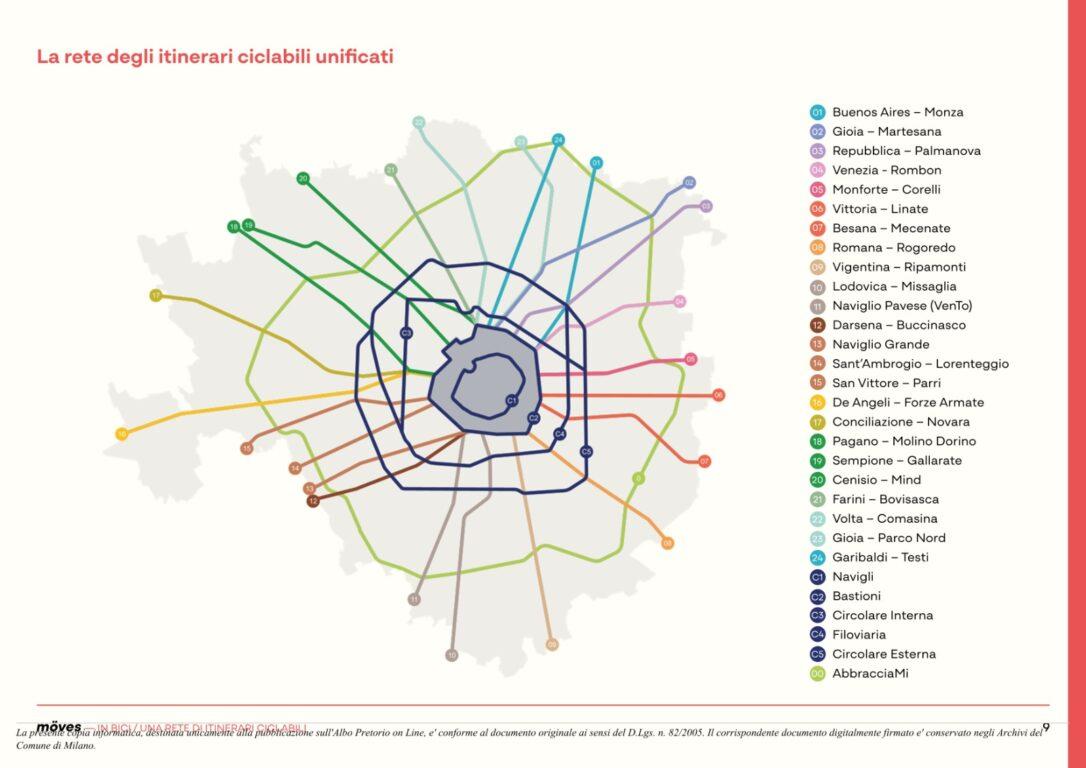 Mappa della Bicipolitana di Milano, con 24 percorsi radiali di colori diversi e 6 circolari