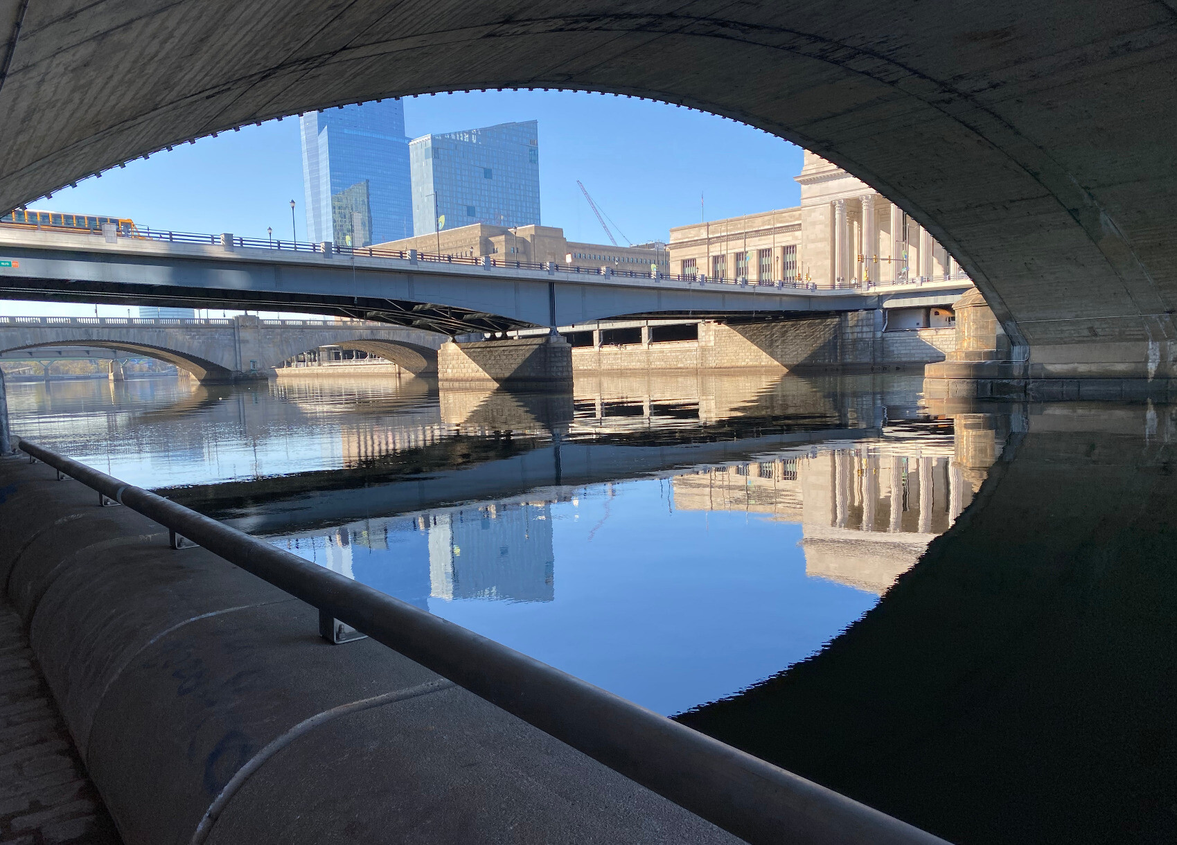 View of the Schuylkill River from the Schuylkill River Trail -- perspective is under one bridge (arching across the top of the image) and looking down river at several more. The bridges appear in shades of tan stone, with some blue metal; the sky above and water below are blue; and there are buildings visible above the bridges -- two modern blue glass and one, to the side, with classical sandstone facade and columns.