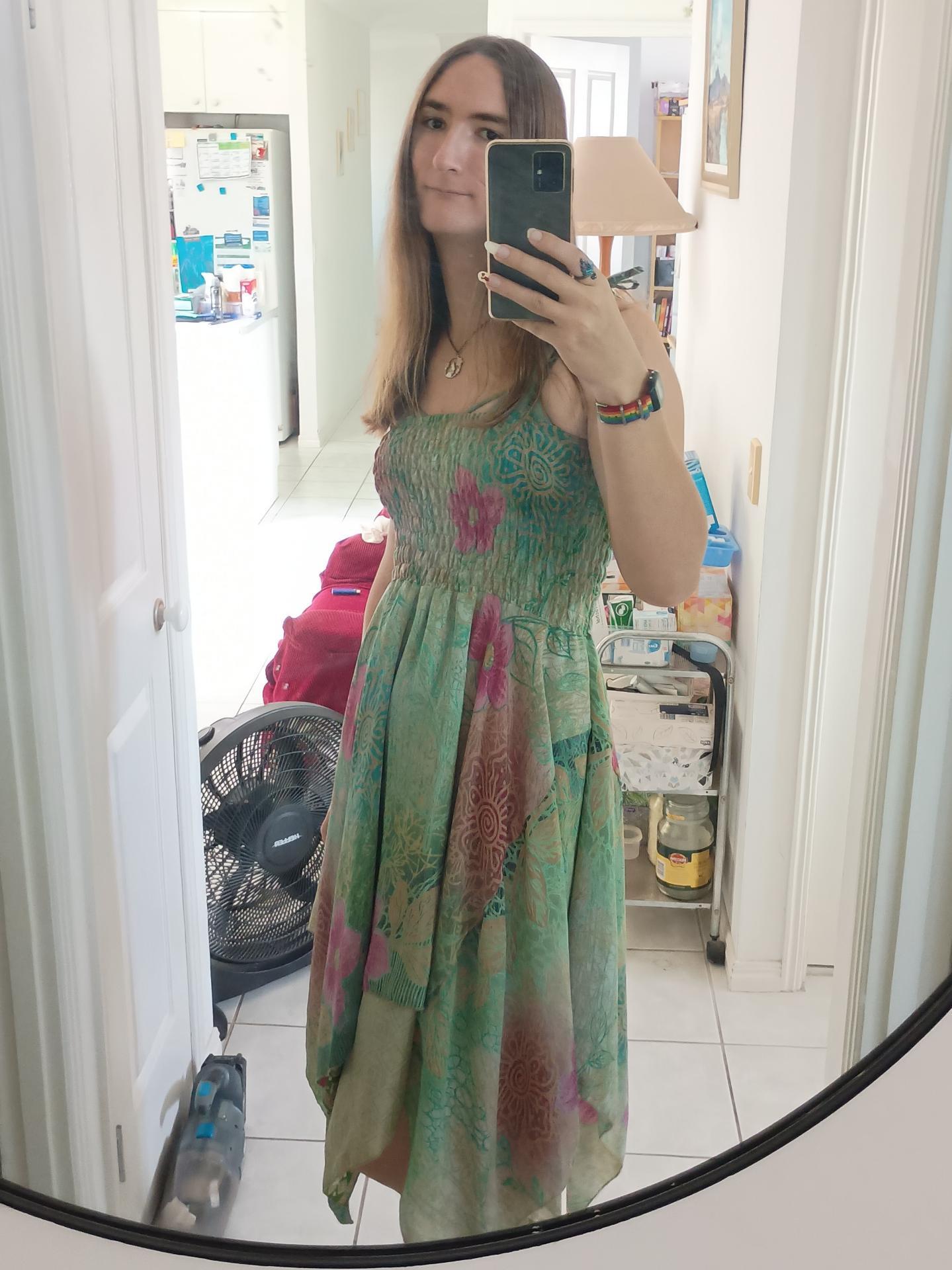 Izzy, standing in her hallway, showing off a green silk dress with a shirred bodice, constructed out of multiple layers that end on an angle to the overall hem of the dress. It's sleeveless and strappy at the top, and extends roughly to her knees.