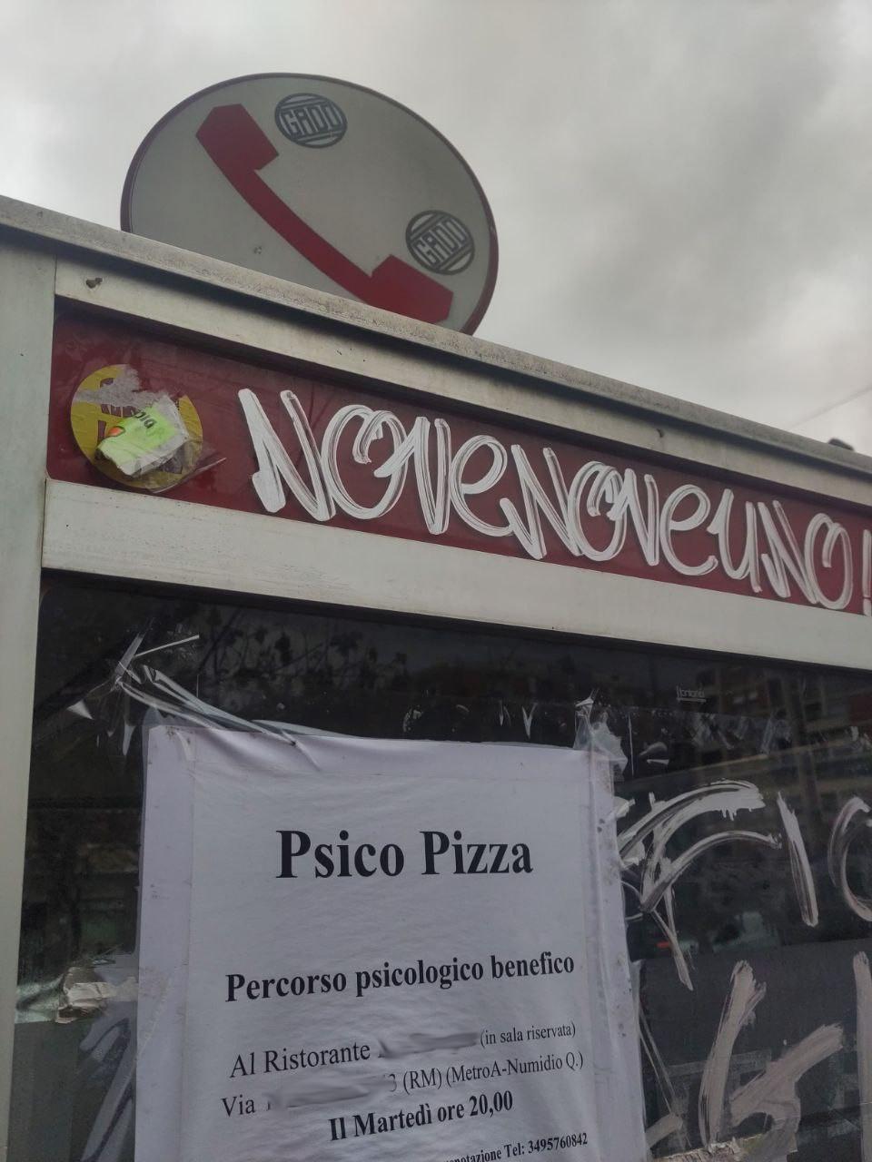 Su una cabina telefonica c'è appeso un volantino che riporta: Psico Pizza Percorso psicologico benefico Al ristorante tal dei tali (in sala riservata) Via tal dei tali (Metro A - Numidio Q.) Il martedì alle 20,00