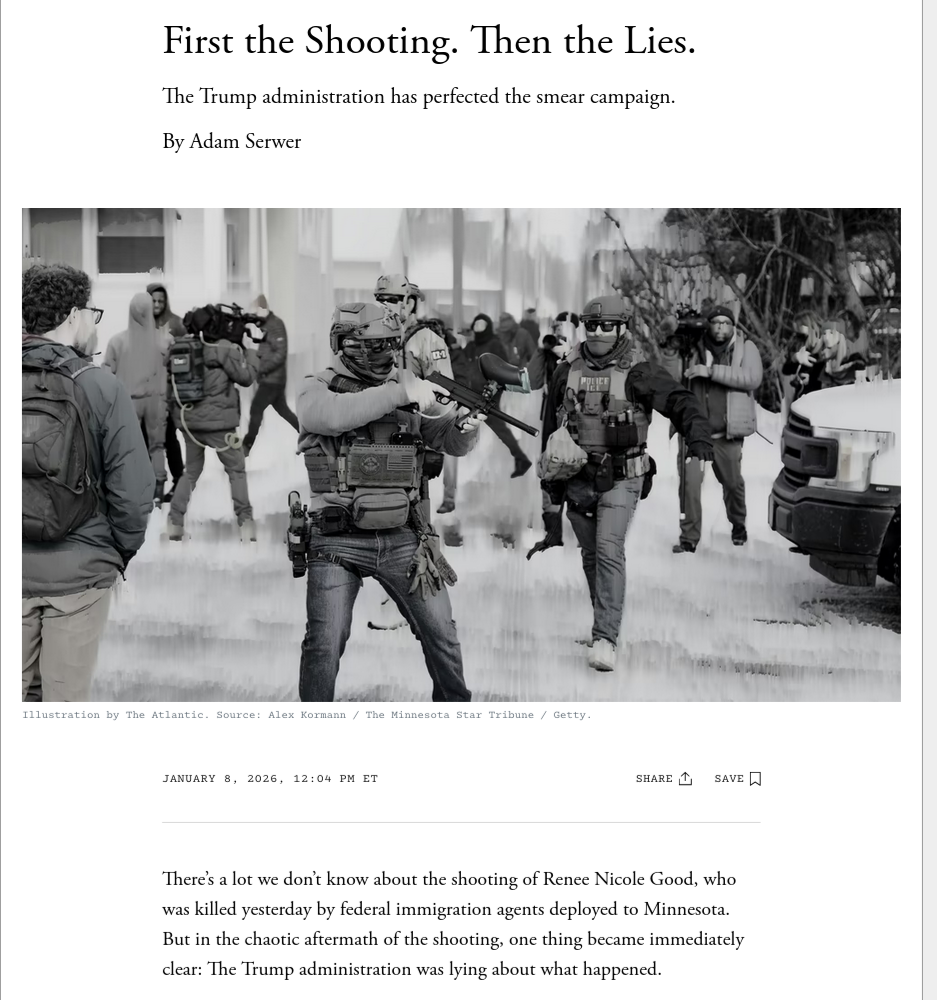 First the Shooting. Then the Lies. The Trump administration has perfected the smear campaign. January 8, 2026, 12:04 PM ET Thereβs a lot we donβt know about the shooting of Renee Nicole Good, who was killed yesterday by federal immigration agents deployed to Minnesota. But in the chaotic aftermath of the shooting, one thing became immediately clear: The Trump administration was lying about what happened.