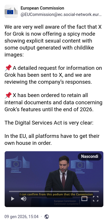 Il toot della Commissione europea in cui dicono che sono a conoscenza di questa funzione e che chiedono spiegazioni a X