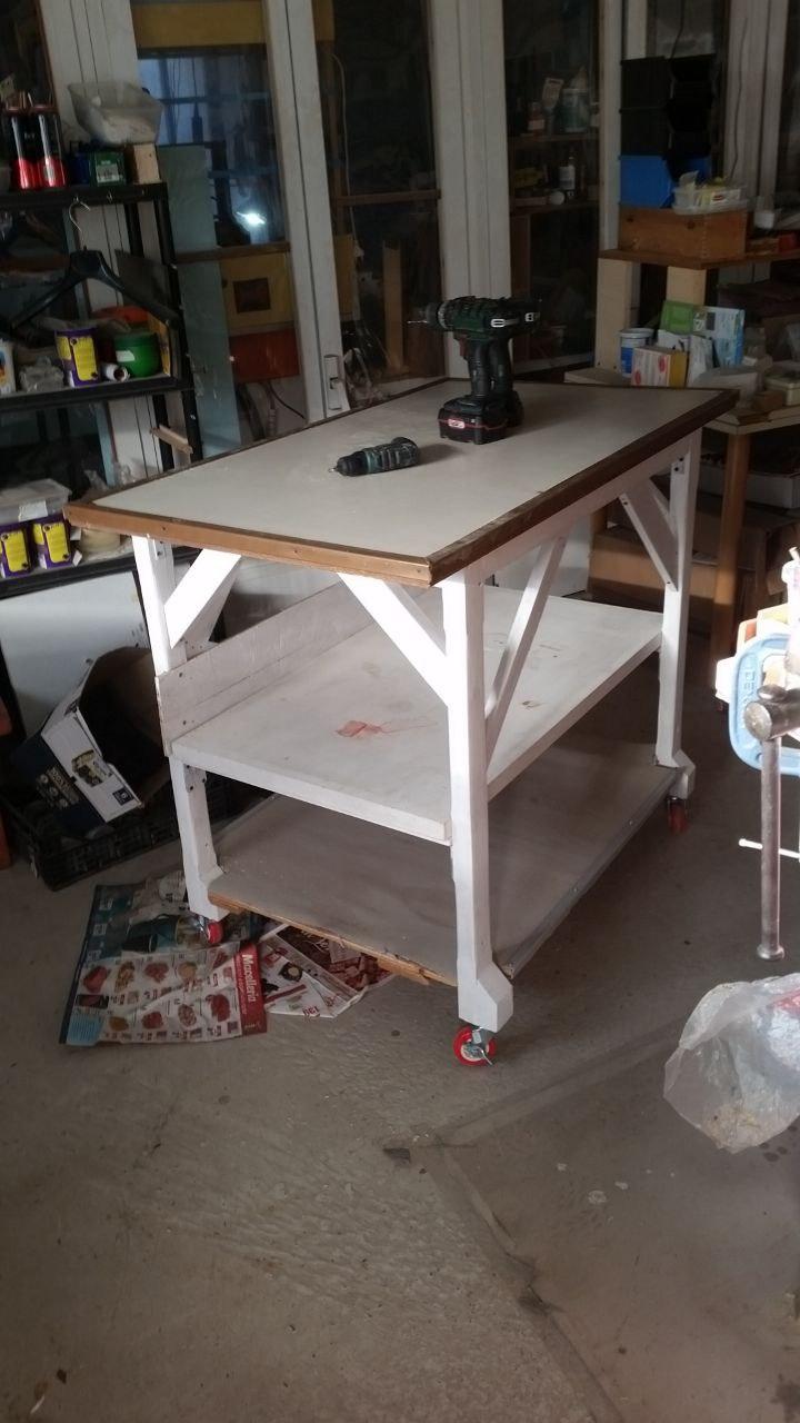 Tavolo semovente con due saette per ogni zampa. Sopra un paio di trapani avvitatori Lidl.