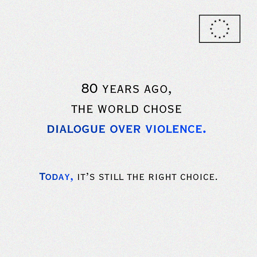 The text in black on grey texture background reads: β80 years ago, the world chose dialogue over violence. Today, itβs still the right choice.β The EU logo in bla in the top right corner.
