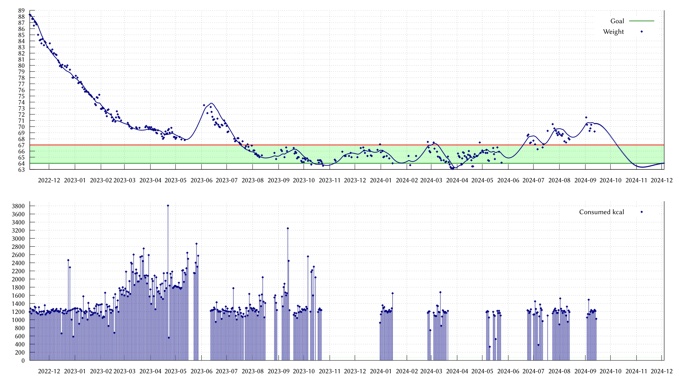 A graph of my weight, and of how many calories I ate. My weight is currently slowly oscillating upwards.