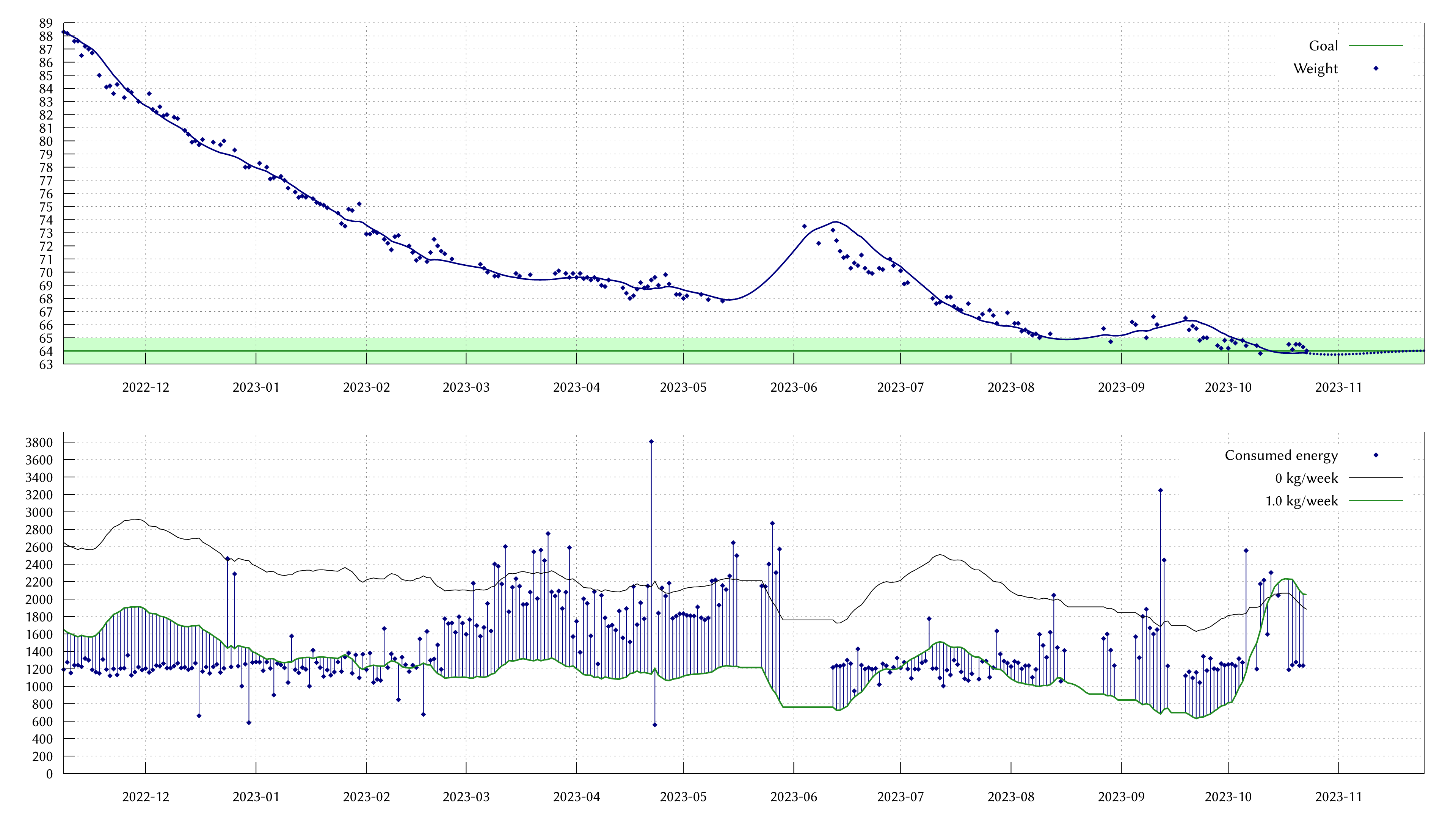 A graph of my weight. Over the past month, I've slowly approached 64 kg.