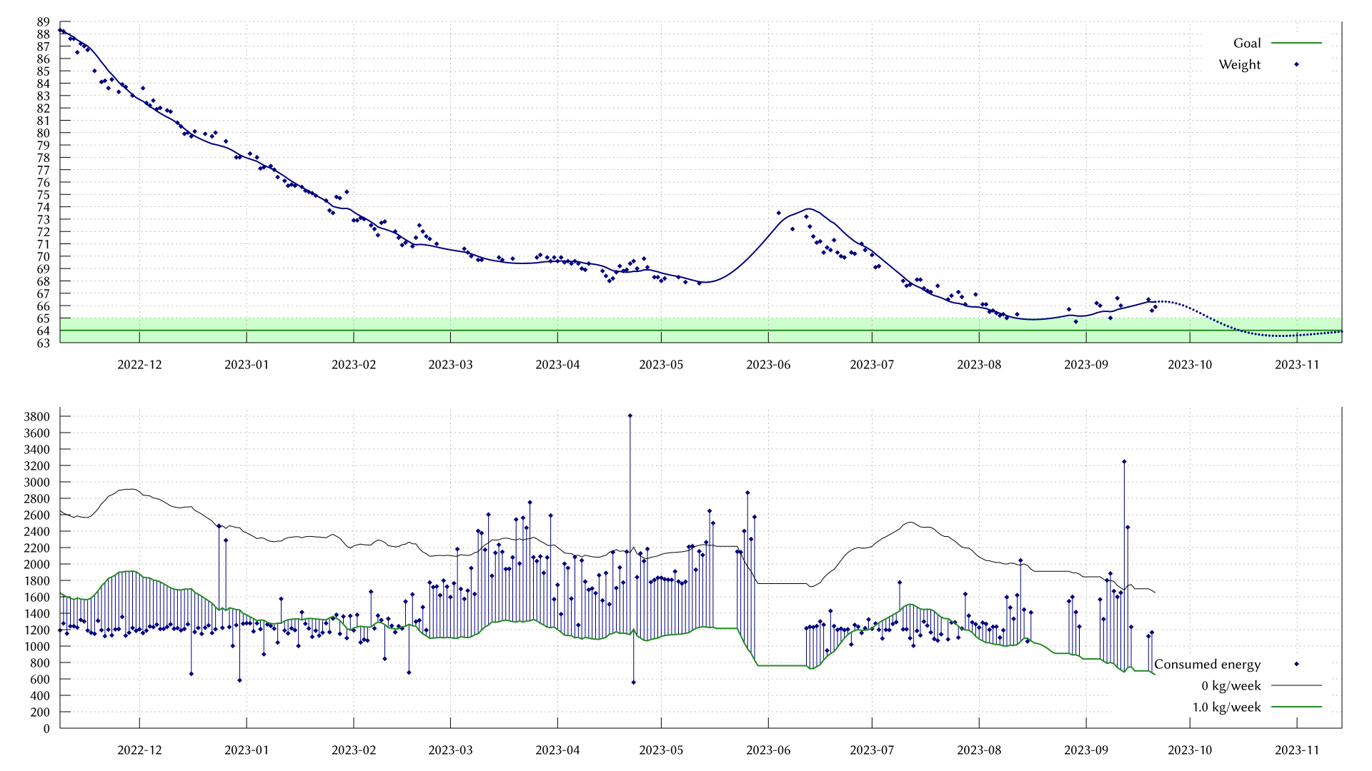 A graph of my weight. Since two months, it hovered around 66 kg. I tracked it on and off.