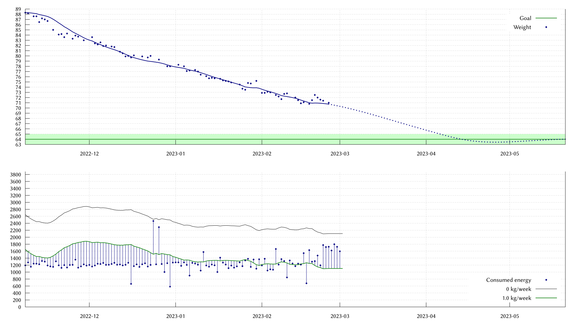 A graph: I've been eating ~1700 kcal since a week, a change from ~1200 kcal before that. My current weight is unknown.