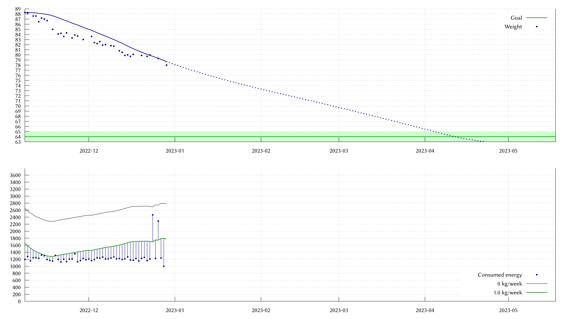In the weight graph, I've now reached a weight of 78 kg. On two days, I ate over 2000 kcal, but on the others around 1200.